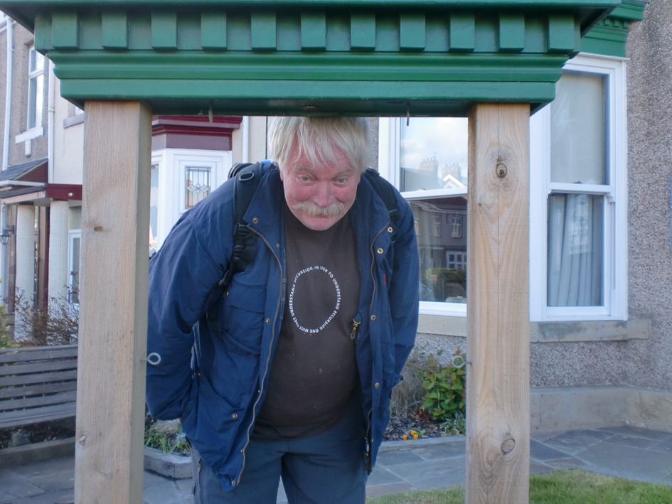 Hva er da bedre enn et bilde av ham, den store mannen som må bøye seg under en kopi av the Penshaw Monument i hagen til gjestehuset vi ofte benyttet.